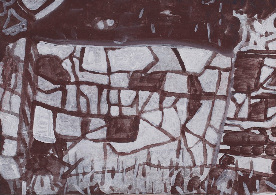 Acrylic, gouache and shoe polish on brown cardboard, 14 x 20.2 cm