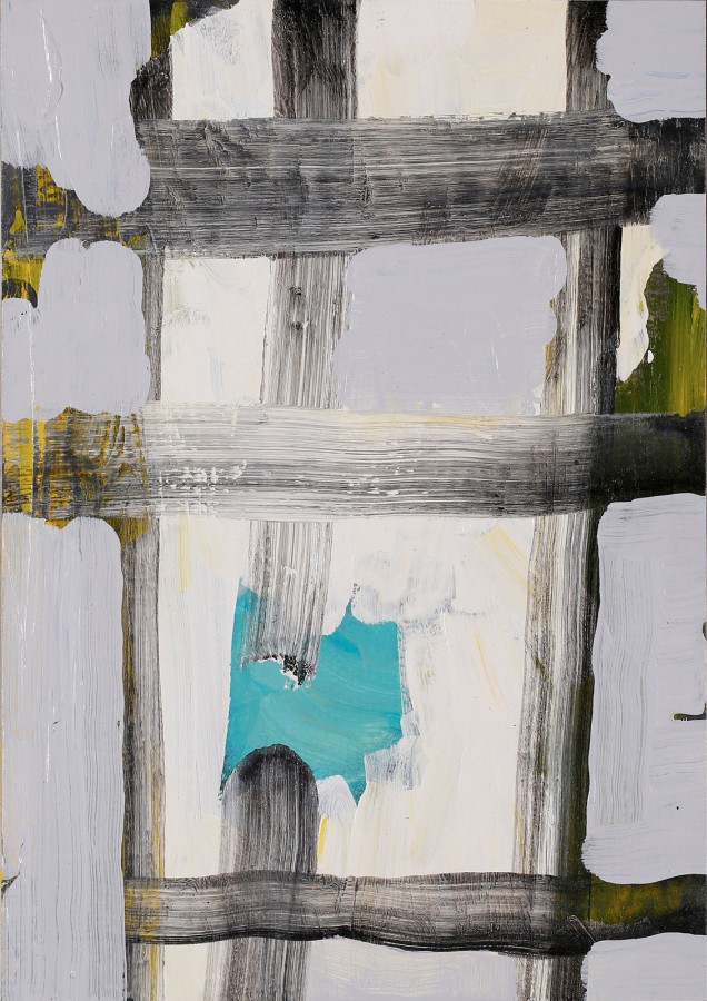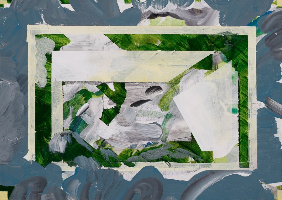Acrylic, ink, marker and tape on greyboard, 20.6 x 14.6 cm
