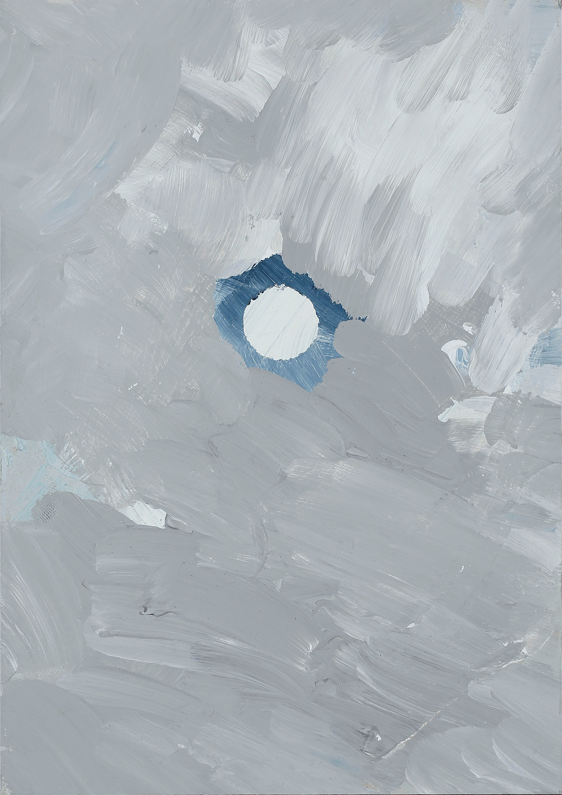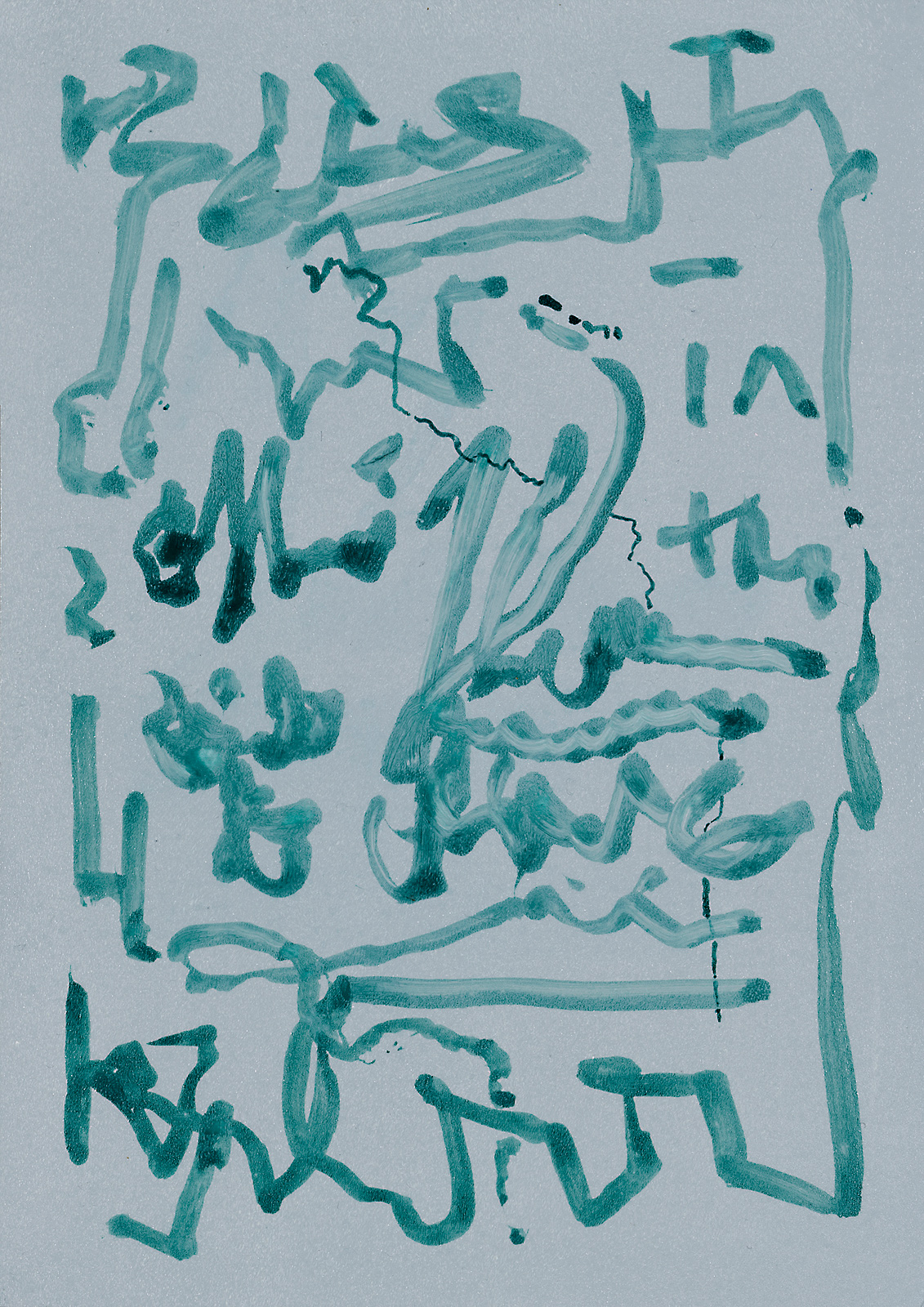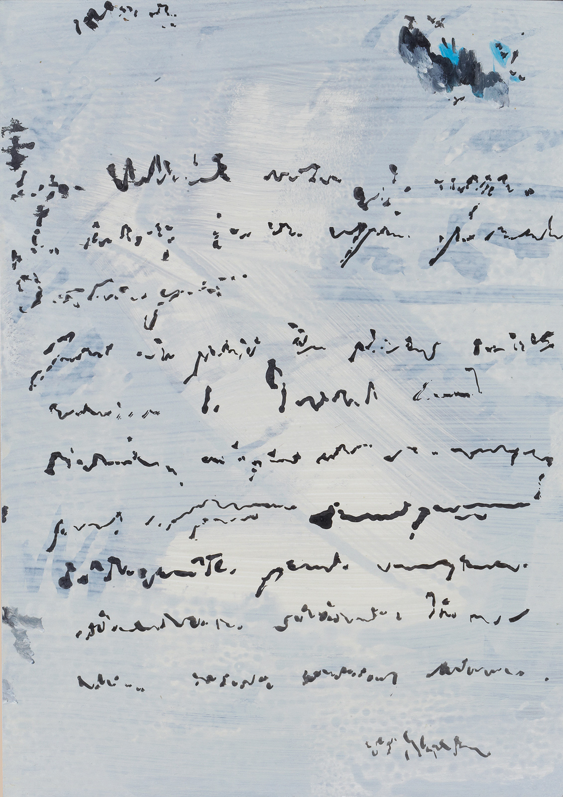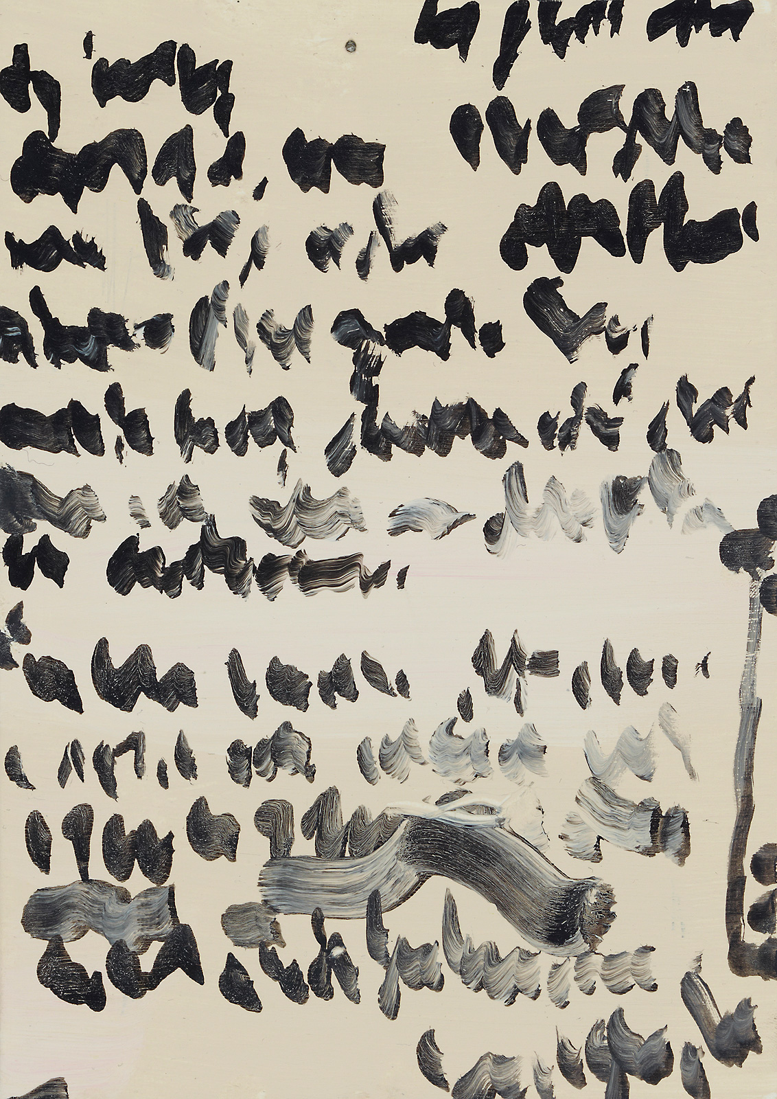 Above, a row to the right, the form of a circle or dot stenciled out over a window comes to mind. I discover another panel which has a palimpsest quality to it. Yet, the background differs from a plain-coloured parchment. This parchment reveals smudges and horizontal strokes of black ink, along with a large wiping gesture. The writing on top records the gesticulation of writing, not anything but movement. It is a voiceless imitation. Seen from the perspective of the alphabet, the figures might be formless scribbles. First a dabbing, then a breaking off; a pause, a slow moving of the brush across the panel, all followed by horizontal lines which continue for another centimetre. Nothing is underlined.