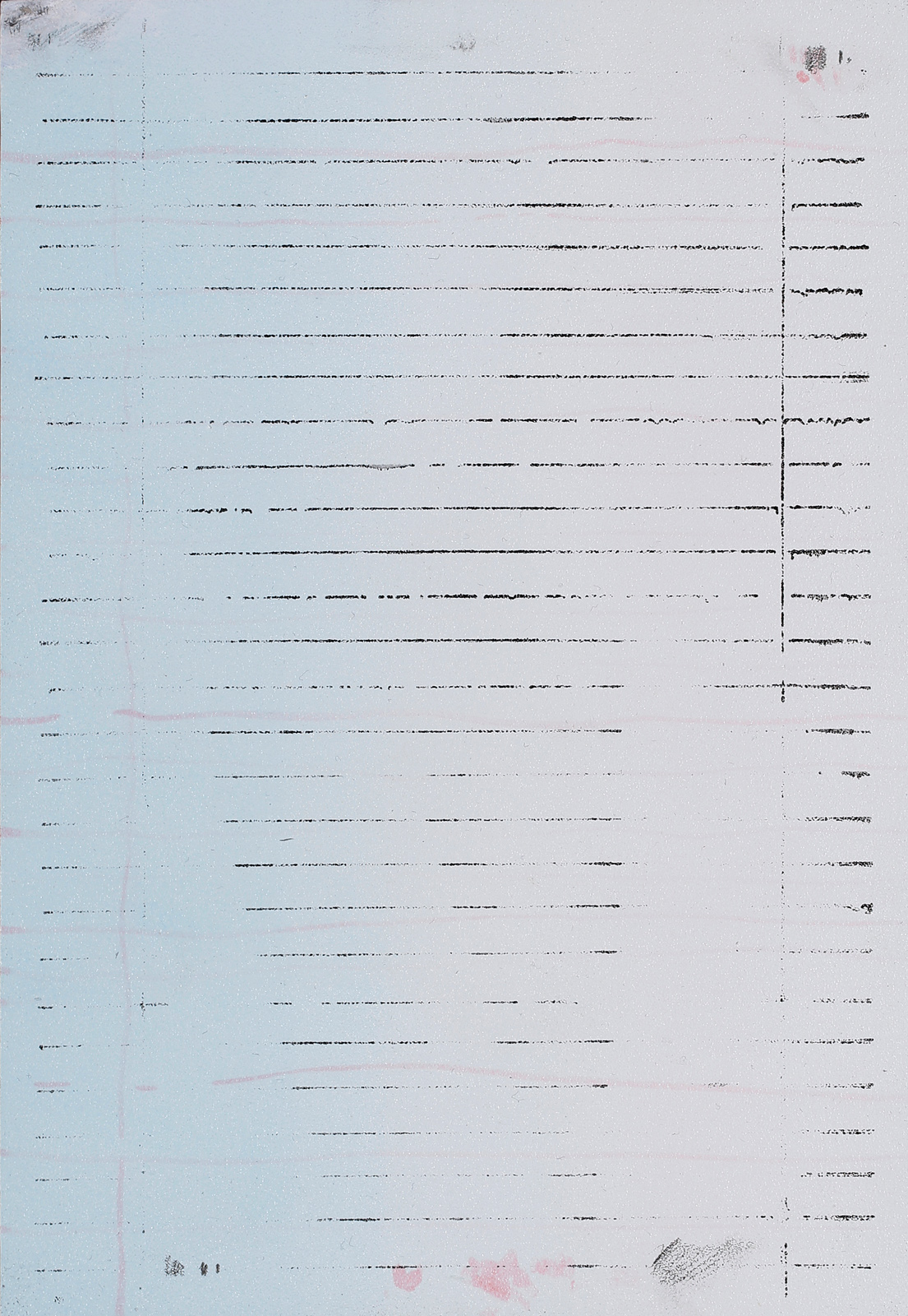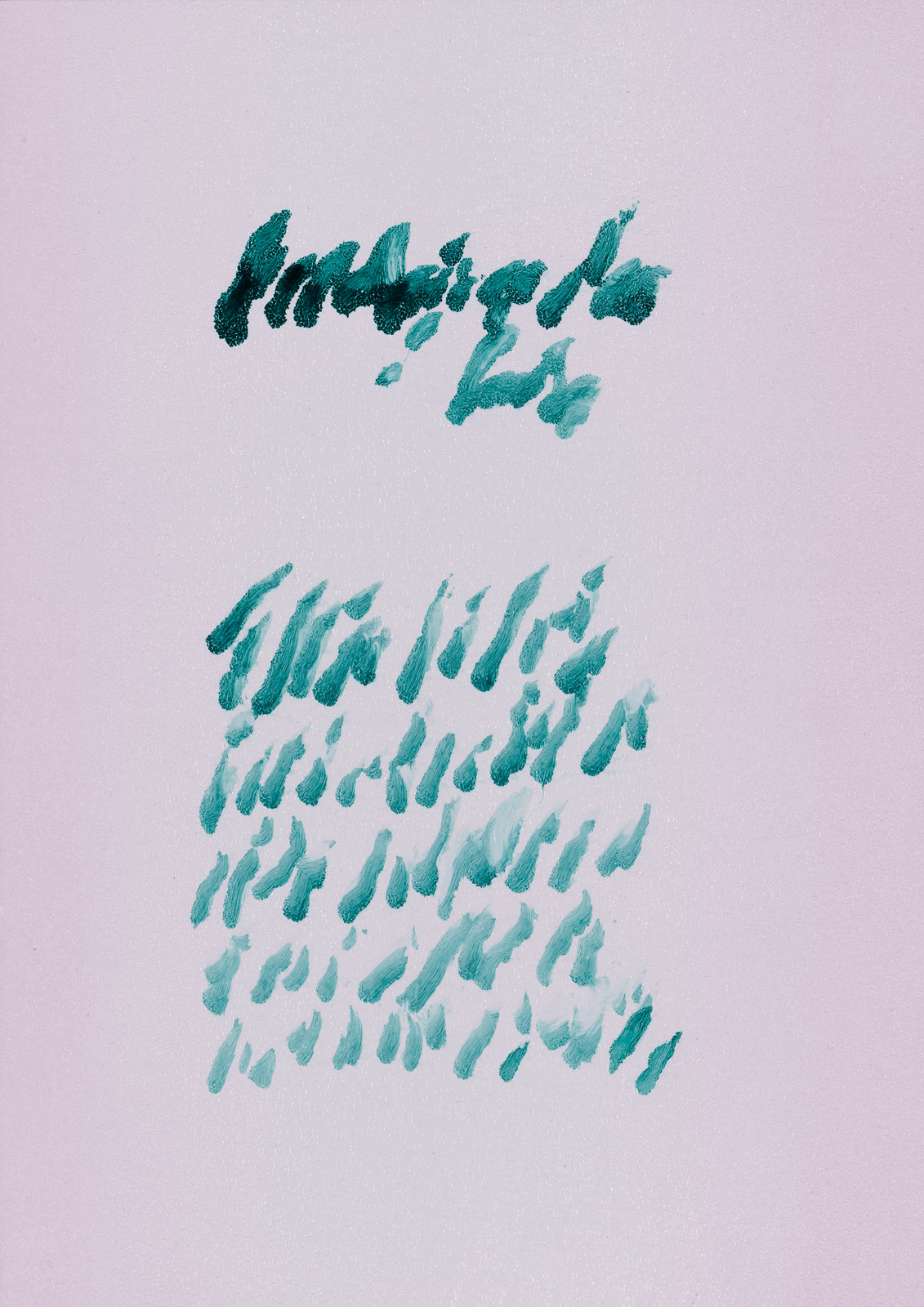 A pink-to-white-to-pink gradient, with short, jagged, abrupt vertical strokes divided into two blocks. The strokes contain no typographic forms like bowls or counters. The two blocks are centred; the upper one is denser and shorter, whereas the lower one could be grass of some sort. Another page based on the book. Beneath the surface, a second layer shines through. The writing on the top seems small and spaced out; this is supported by smaller writing underneath. What about calling it ‘An inoperative shorthand’. The impression is unbalanced; vertical strokes are exaggerated.