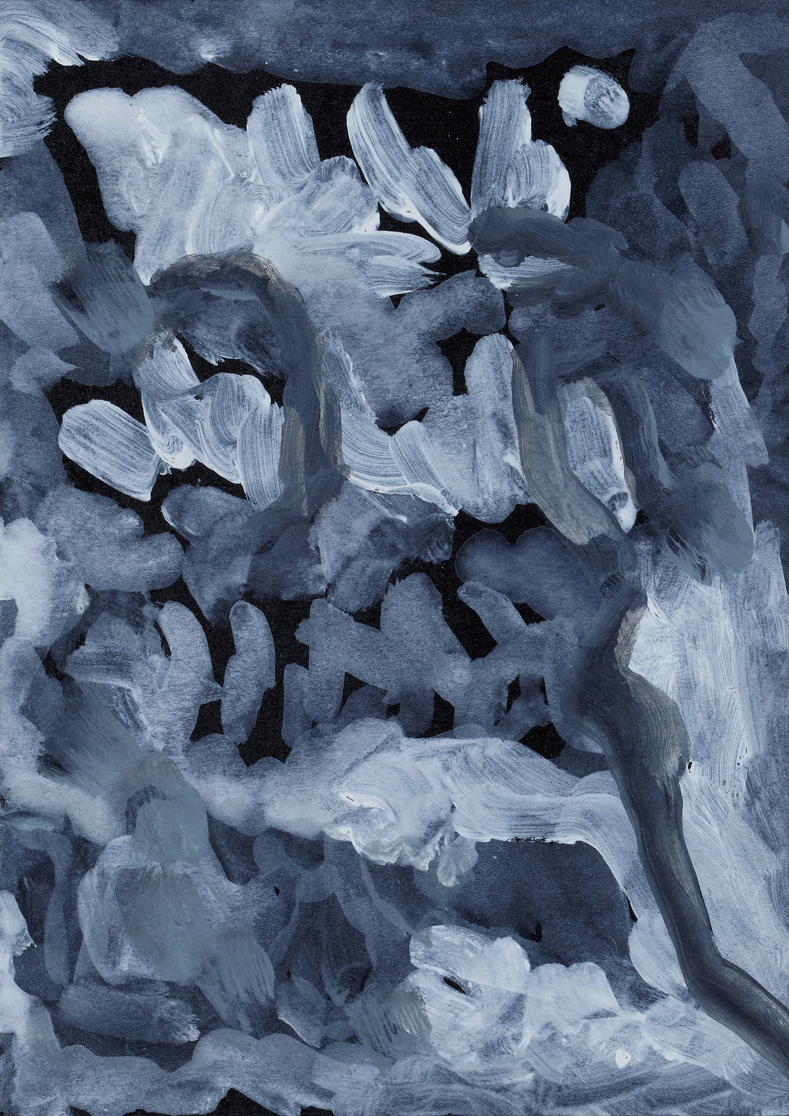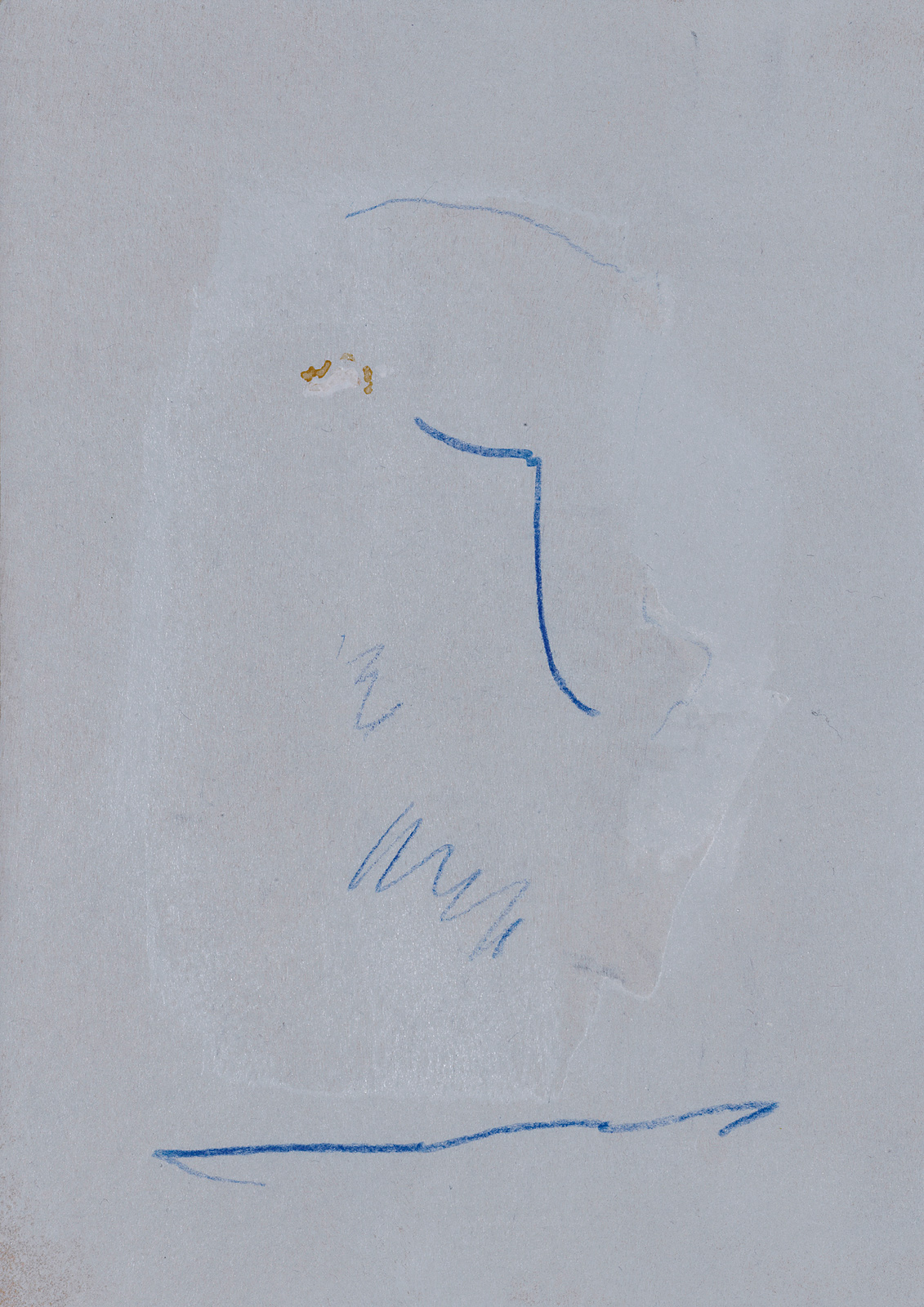 The whitish strokes dissolve into a greyish fluid on the black background. Is it handwriting? A landscape or a rock formation? Blue pencil drawing on grey background. The profile of a person?